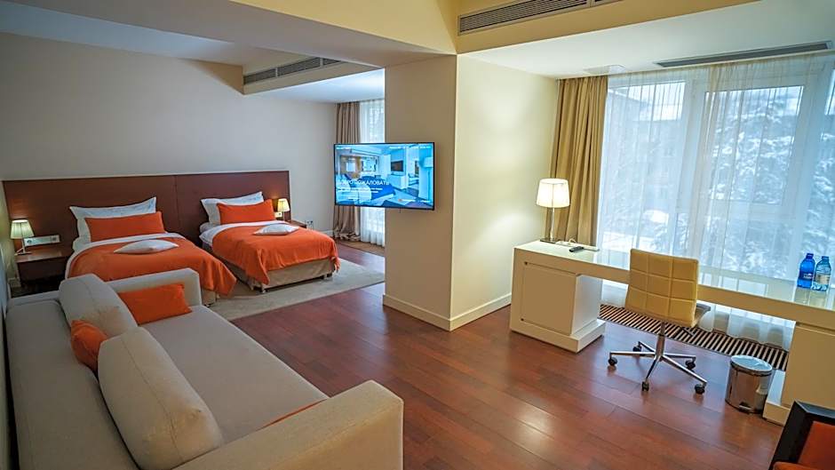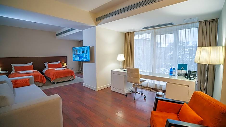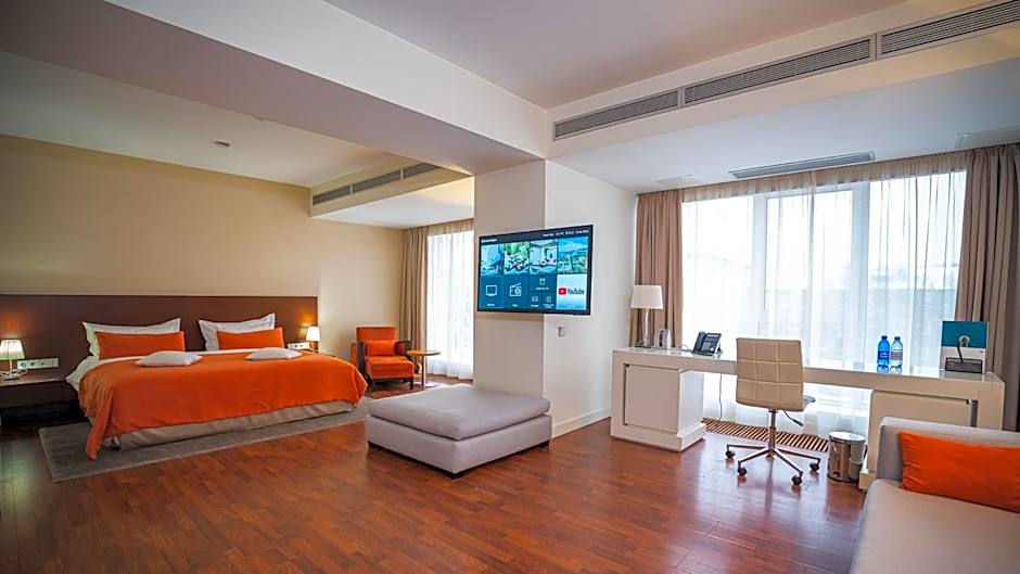 Spacious suite with a luxury bathroom and king-size bed, decorated in warm colors.